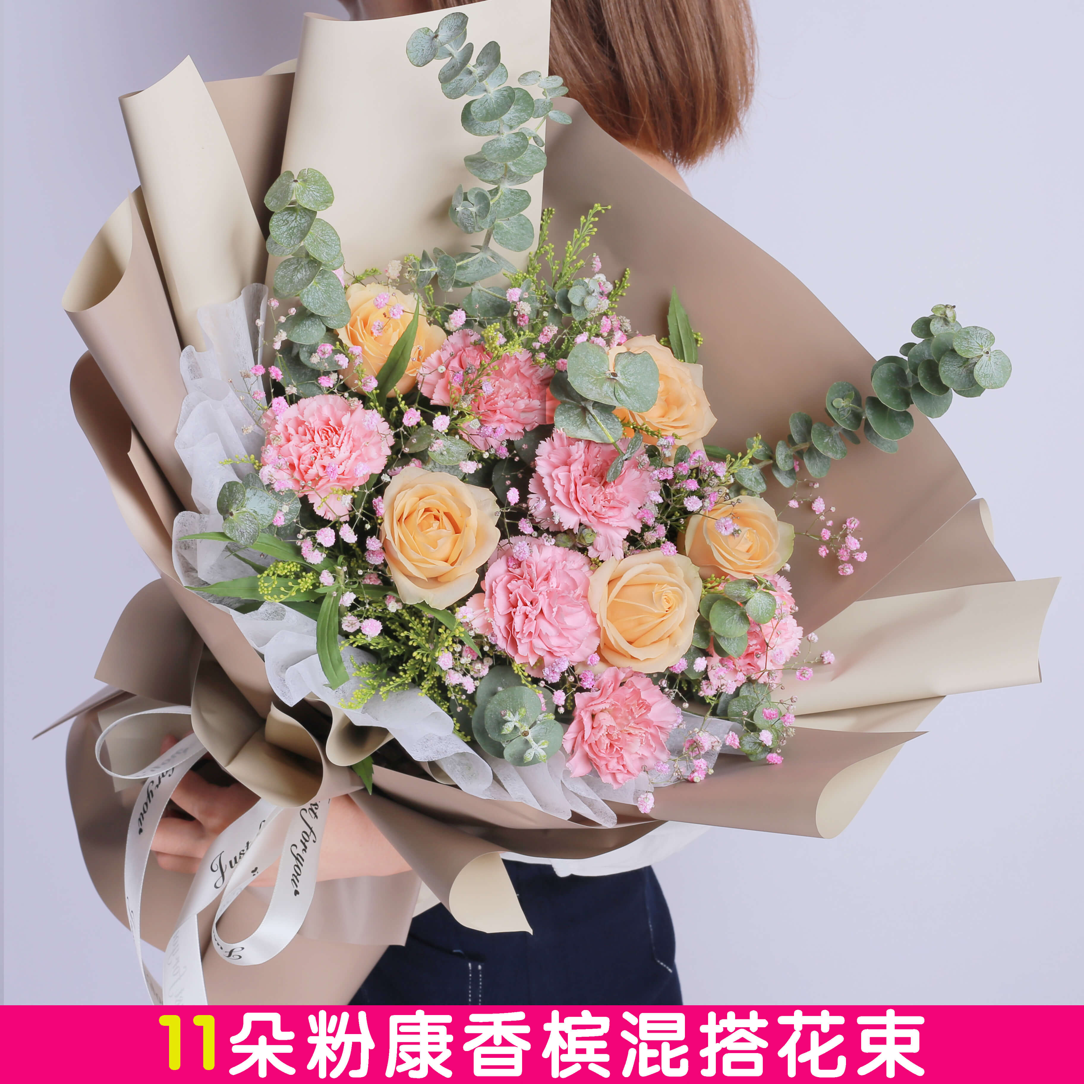 11朵粉色康乃馨香槟玫瑰混搭花束